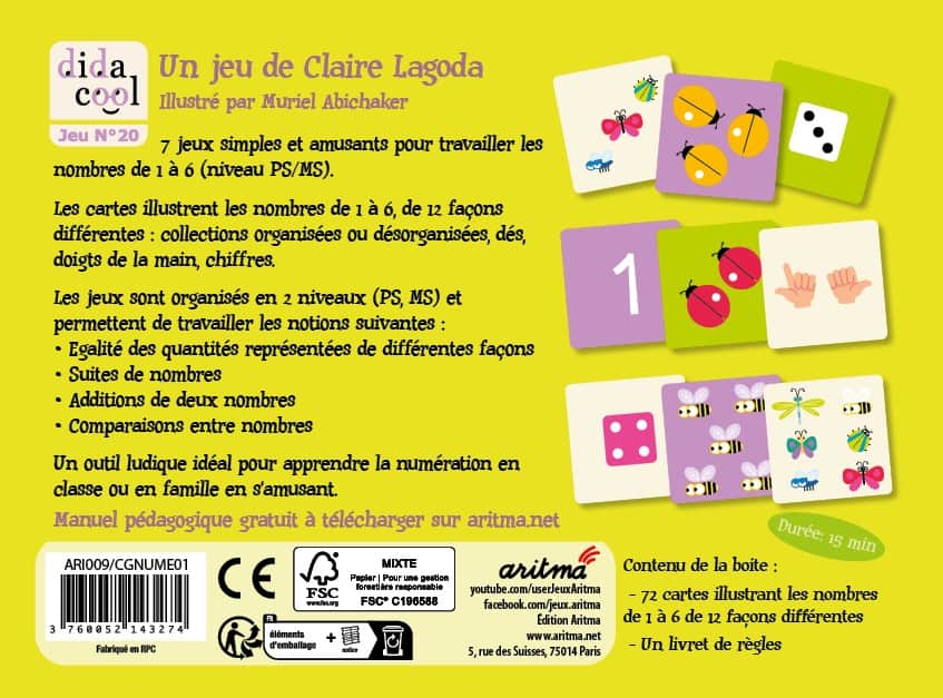 Un jeu simple, amusant et progressif. Composé de 7 règles de jeu, et de 4 niveaux de progression, il aide les enfants à maitriser la numération par une approche ludique sur les nombres de 1 à 6.
